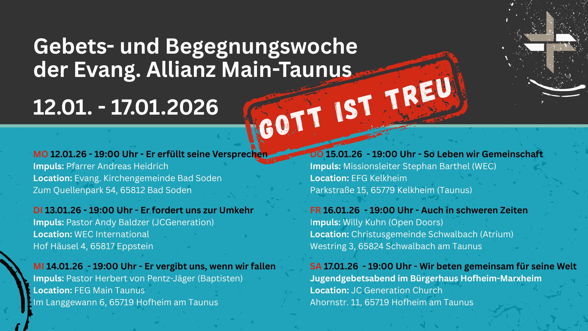 Willkommen auf der Seite der Evangelischen Allianz Main-Taunus. Wir sind ein Zusammenschluss von Menschen, die an Jesus Christus glauben.